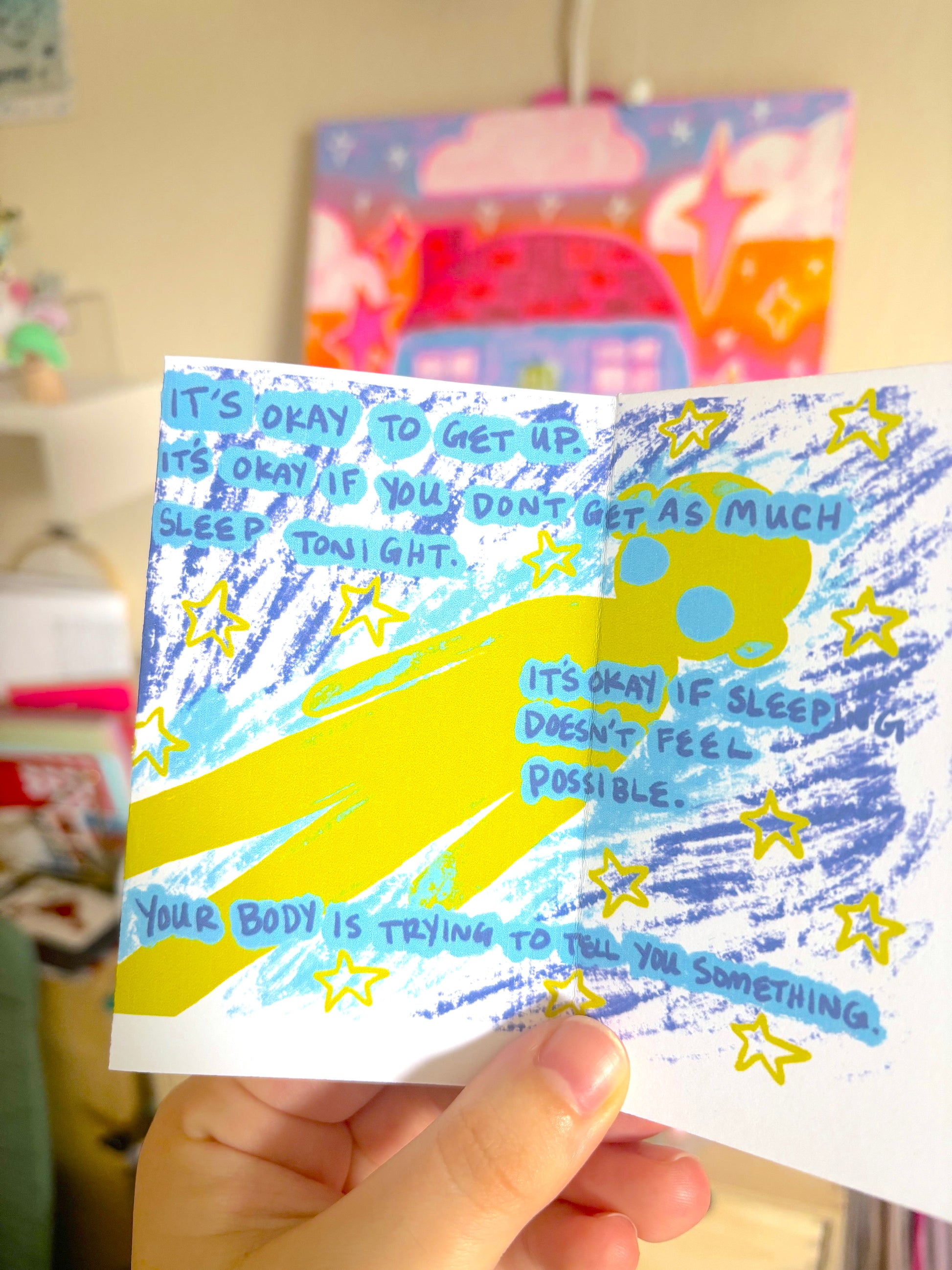 A heartwarming and gentle 16-page zine addressing insomnia; perfect for a middle-of-the-night read when you cant get back to bed.