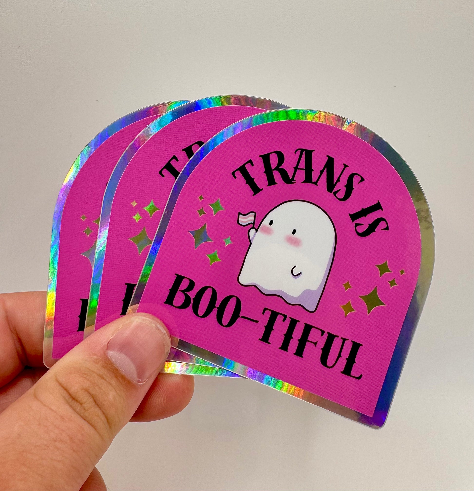 Our Trans is Boo-tiful design has quickly become a bestseller for good reason! This adorable ghost carrying the trans flag is a precious, genderless (or genderful!) icon, sharing the empowering message: "Trans is Boo-tiful." Perfect for sending love to yourself or a special someone, this cutie will brighten anyone's day.